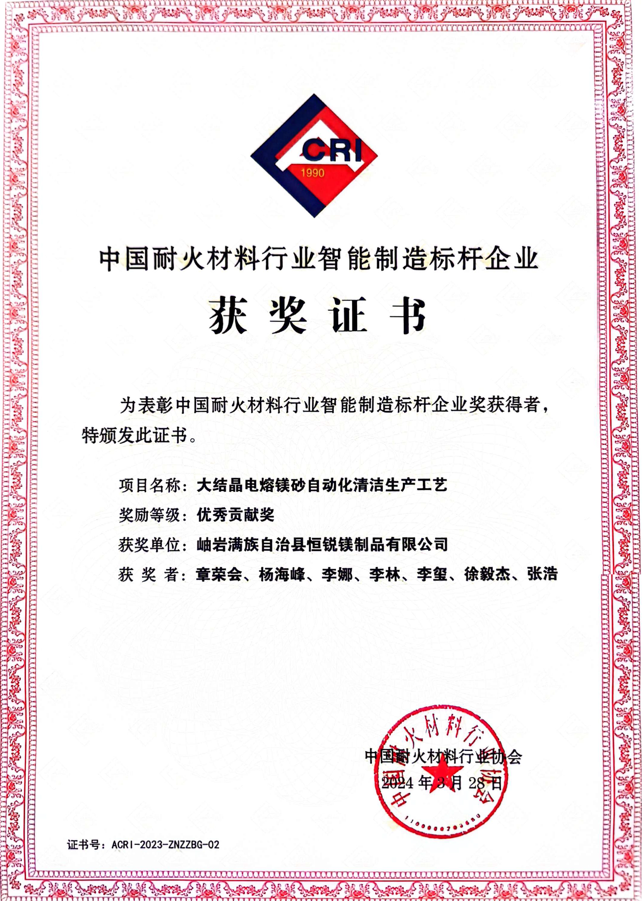 中國耐火材料行業(yè)智能制造標桿企業(yè)(優(yōu)秀貢獻獎)